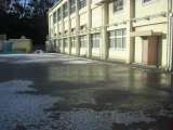 昨晩降り続いた雪が、かちかちに氷りました。校庭は、まるでスケートリンクのようでし...