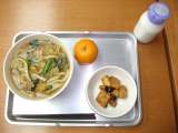 献立は 「カレーうどん、いかとさつま芋の揚げ煮、ぽんかん、牛乳」です。 【ぽん...