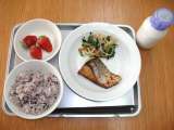 献立は 「黒米ごはん、鰤の照り焼き、野菜の辛子醤油、いちご、牛乳」です。 明...