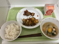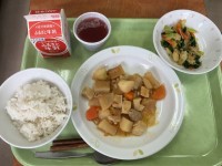 今日の給食は、麦ごはん、豚肉と大根のうま煮、野菜のからしじょうゆかけ、ぶどうゼ...