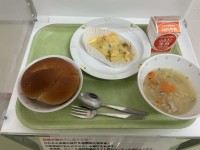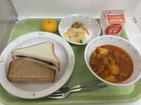 今日の給食は二食サンド(ブルーベリー・クリームチーズ)、有機野菜のポークシチュ...