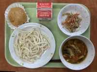 今日の給食は、秋の味覚をたっぷり楽しめる献立でした。カレーつけうどんは、つるつ...