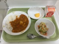 今日の給食はハッシュドポークライス、香味ドレッシングサラダ、柿でした。今日のハ...