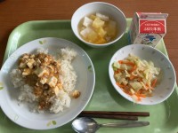 今日の給食は麻婆豆腐丼、中華サラダ、杏仁豆腐でした。6年生のクラスでは麻婆豆腐...