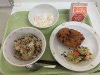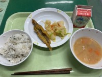 今日の給食はわかめ入り麦ごはん、ししゃものカレー揚げ、和風ポテトサラダ、豚汁で...