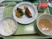 今日の給食は、ごはん、魚のみそだれかけ、小松菜とちくわのあえもの、すまし汁でし...
