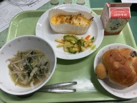 今日の給食はぶどうぱん、フレンチエッグ、にんじんドレッシングサラダ、白菜のスー...