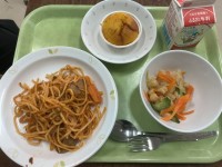 今日の給食は、スパゲッティナポリタン、イタリアンサラダ、カボチャのケーキでした...