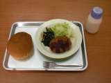 今日の給食は、丸パン・コロッケ・ボイルキャベツ・ほうれん草とコーンのソテー・牛...