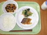 献立は 「ごはん、魚のみそマヨネーズ焼き、ひじきの煮つけ、野菜のゆかりかけ、牛乳...