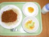 献立は 「スパゲッティーミートソース、コーンサラダ、柿、牛乳」です。 ...