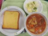 献立は、 「フレンチトースト、トマトシチュー、りんごとはくさいのサラダ、牛乳」...