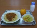 今日の給食は、スパゲティミートソース・キャベツサラダ・くだもの・牛乳です。 ...