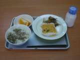今日は食育の日です。今日の給食は、ごはん・ふりかけ・千草焼き・くきわかめのきん...