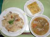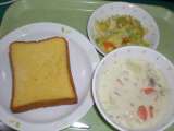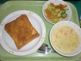 献立は、 「フレンチトースト、シーフードシチュー、コーンサラダ、牛乳」です。 ...