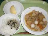 献立は、 「ごはん、ふりかけ、豚肉と大根のうまに、くだもの、牛乳」です。 ...