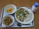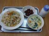 4月13日(金)、今日の給食は、パエリア、キャベツスープ、キャロットケーキ、牛...