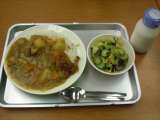 4月20日(金)、今日の給食は、カレーうどん、きゅうりの甘酢かけ、チーズ入り蒸...