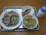 4月18日(水)、今日の給食は、たけのこごはん、かきたま汁、煮豆、牛乳です。 ...