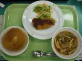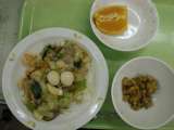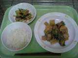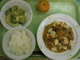 献立は 「ごはん、ジアチャンドウフ、やさいの中華風味、くだもの、牛乳」です。 ...