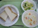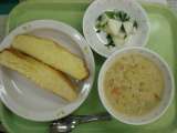 献立は 「ガーリックトースト、チャウダー、やさいのレモンかけ、牛乳」です。 ...