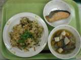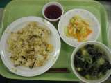献立は 「チャーハン、辣白菜、わかめスープ、ぶどうゼリー、牛乳」です。 チ...