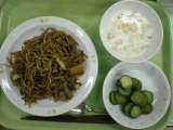 献立は 「ソースやきそば、きゅうりの中華味、フルーツヨーグルト、牛乳」です。 ...