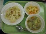 献立は 「3色ピラフ、ベーコンと野菜のスープ、ジャガイモのハニーサラダ、牛乳」で...
