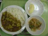献立は 「カレーライス、こんにゃくサラダ、くだもの、牛乳」です。 給食の...