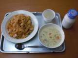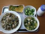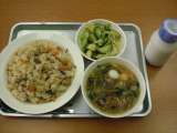 5月14日(月)、今日の献立は、山菜ピラフ、春雨スープ、野菜の中華風味、牛乳で...