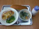 5月30日(水)、今日の献立は、ミルクパン、ポテトグラタン、ゆでブロッコリー、...