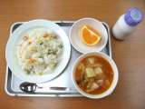献立は 「三色ピラフ、ミネストローネ、清見オレンジ、牛乳」です。 主食は「三...
