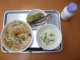 献立は 「煮込みうどん、ししゃもの唐揚げ、ちくわの磯部揚げ、かぶの甘酢かけ、牛乳...