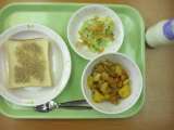 献立は 「フレンチトースト、ハンガリアンシチュー、アスパラガスのサラダ、牛乳」で...