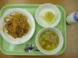 献立は 「ソース焼きそば、辣白菜、フルーツ白玉、牛乳」です。 白玉はも...