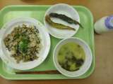 献立は 「豆入りひじきごはん、ししゃもの二色揚げ、みそ汁、牛乳」です。 ...
