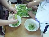 献立は 「グリンピースごはん、魚の立田あげ、野菜のからしじょうゆかけ、清見オレン...