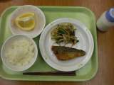 献立は 「ごはん、魚の立田あげ、野菜のからしじょうゆかけ、甘夏みかん、牛乳」です...