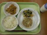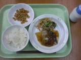 献立は 「ごはん、魚の甘酢あんかけ、野菜のごまだれかけ、ぶどう豆、牛乳」です。 ...