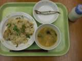 献立は 「豆入りひじきごはん、焼きししゃも、みそ汁、牛乳」です。 みそ...
