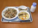 6月21日(火) 今日の給食は、豚肉とごぼうのごはん・みそ汁・ししゃものから揚...