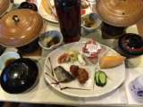 宿での最後の夕食は、陶板焼き、唐揚げ、マスの甘露煮、マカロニサラダ、湯葉とかぼち...