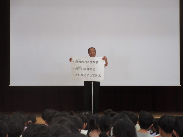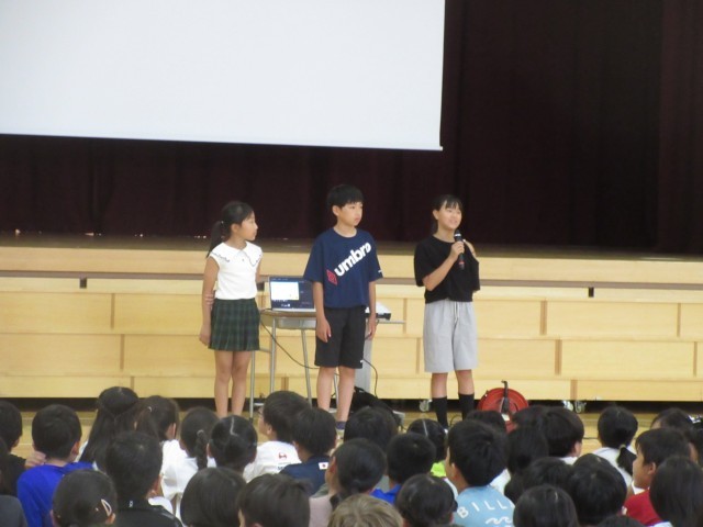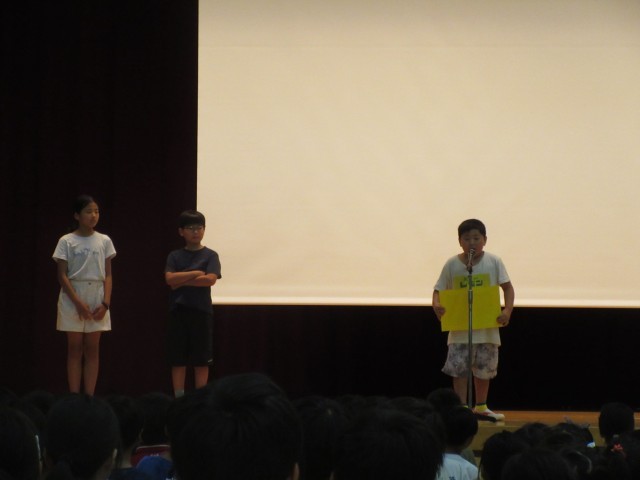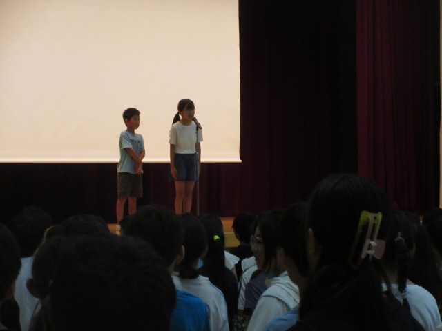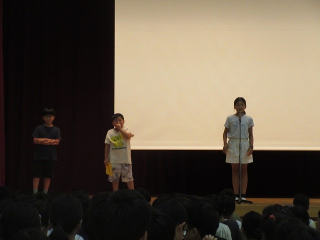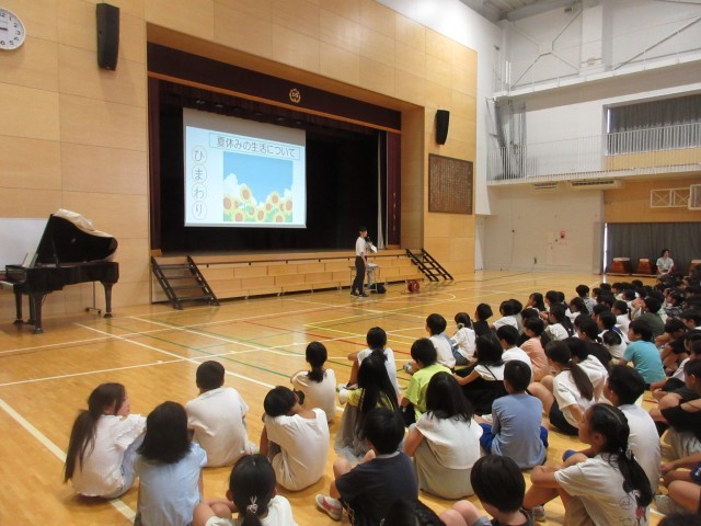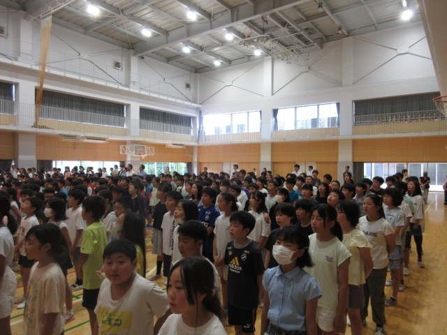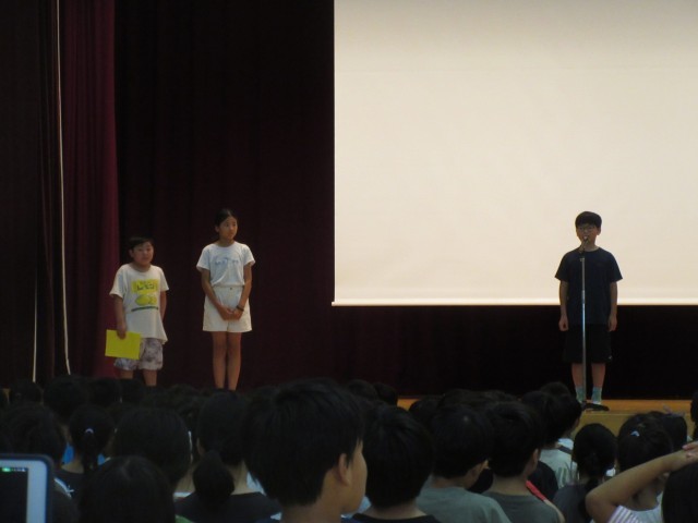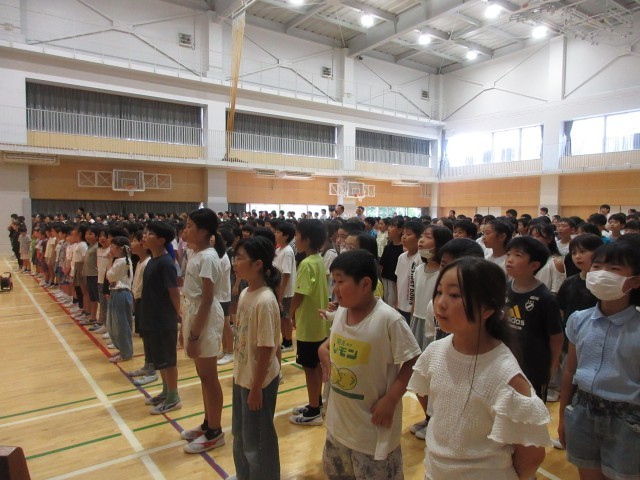 7月18日、1学期の終業式を体育館で行いました。校長先生からは「自分の力を生かす」「お互いを認める」「とにかくやってみる」という点について振り返り、1学期はみんなが頑張る姿を見られたということ、反面、友だちの物を隠したりきずつけたりすることがあったので残念ですというお話がありました。児童代表の言葉では5年生が1学期に自分が頑張り成長できたことや2学期に向けての決意をしっかりと発表できました。最後に全校児童が体育館に響き渡るような校歌を歌い1学期を締めくくりました。終業式後は、転出するお友だちの挨拶、運営代表委員の児童からユニセフ募金の報告、生活指導担当の先生から「夏休みの過ごし方」についてお話がありました。子どもたちにとって貴重な体験をできる素晴らしい夏休みになるように願っています。