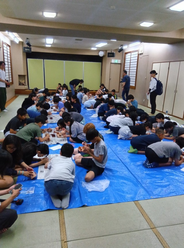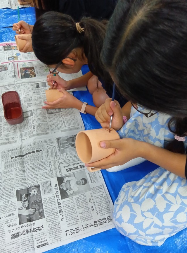 食事が終わり、夜は、益子焼の絵付けに挑戦します。考えてきた絵柄をカップに描いていきます。短い時間ですが無心に取り組み、その姿勢や態度に教えてくださった講師の方から褒めていただきました。みんな元気です。9時半には就寝となります。