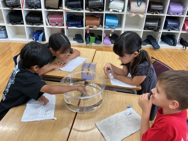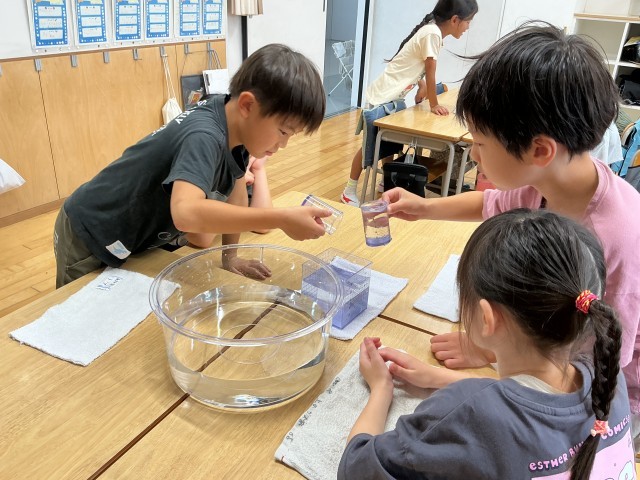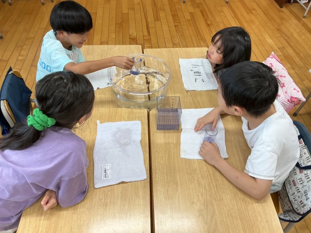 算数では、「水のかさ」の単元を学習しています。新しい「dL」「L」という単位を学習し、量感を理解するために班ごとに1Lが1dL何杯分かを試す活動を行いました。実際に量ってみてdLとLの関係がよくわかったようです。
