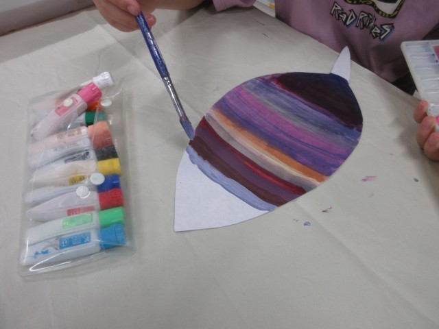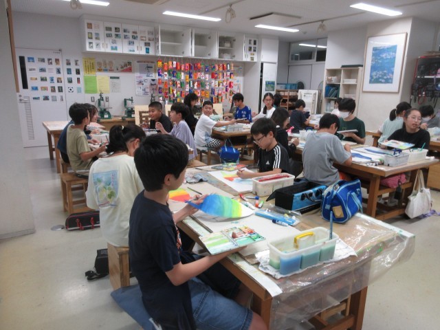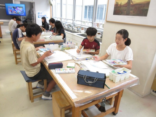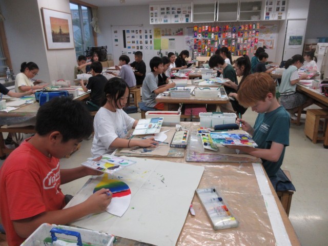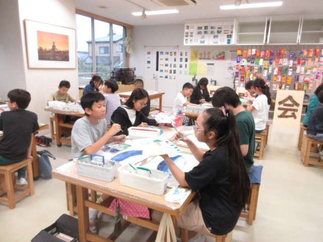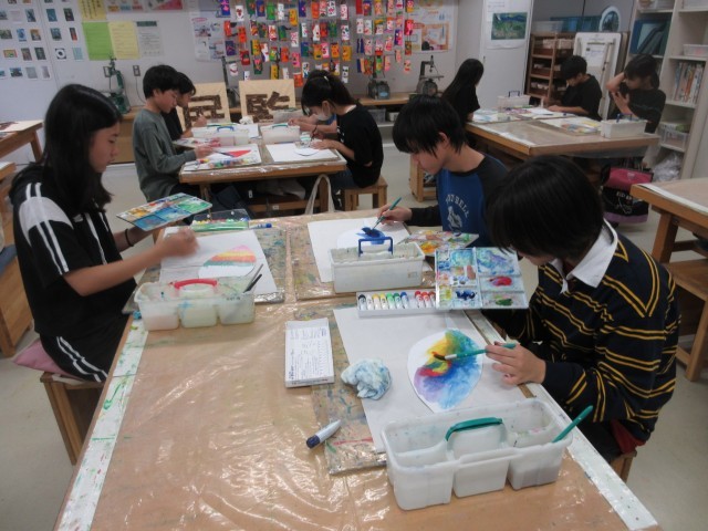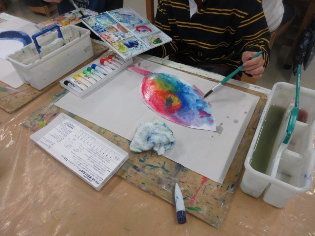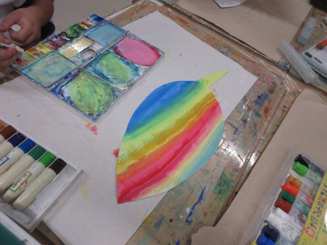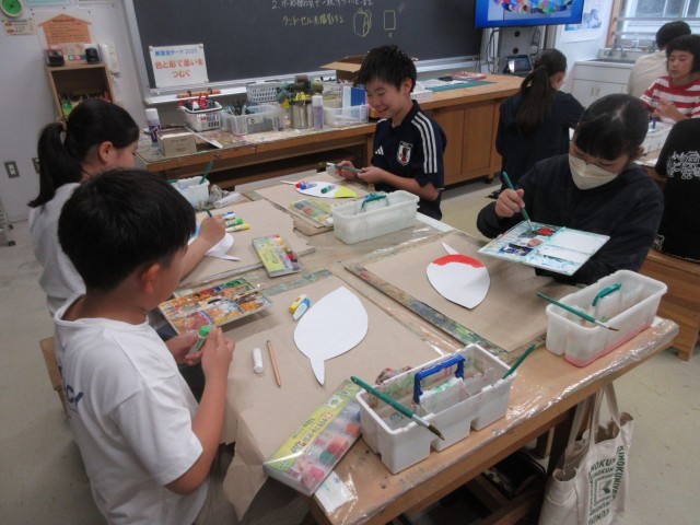 秋に開催予定の展覧会に向けて、子どもたちが図工授業で作品制作している様子を学校ホームページで紹介します。2学期最初の授業、6年生は共同製作「未来への翼」に取り組みました。この題材のねらいは子どもたちがなりたい自分をイメージして未来へ飛び立つための翼をつくることです。一人一人が未来への夢を膨らませ、羽の色や模様を水彩絵の具で描きました。展覧会では6年生全員の羽を翼にして展示しますのでご期待ください。
