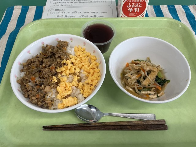 大豆とごぼうのそぼろ丼(炒り卵入り)