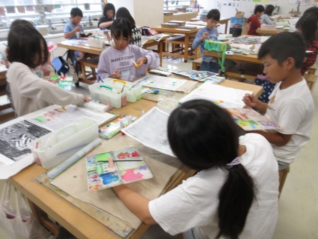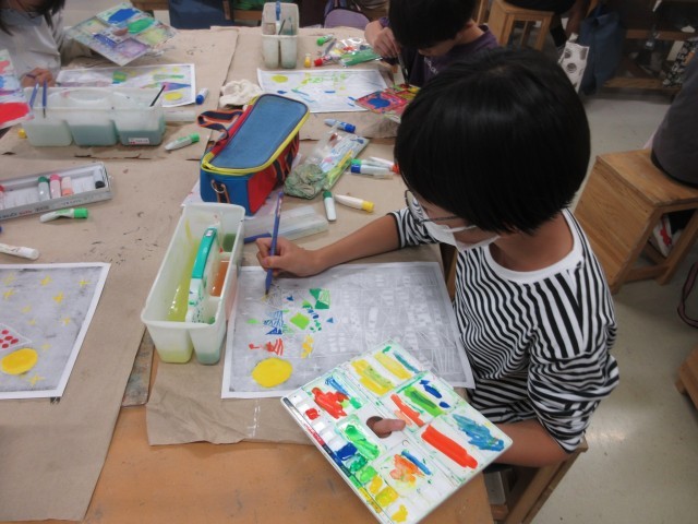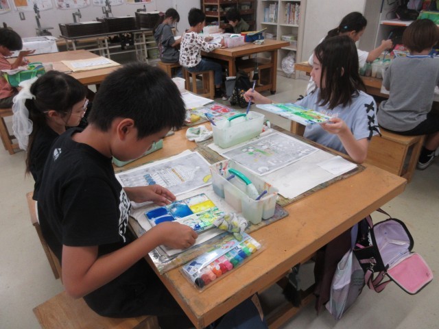 秋に開催予定の展覧会に向けて、子どもたちが図工授業で作品を制作している様子を学校ホームページで紹介します。4年生は題材「夢のお城」で木版画表現のよさを体験しました。黒いインクで刷った版画用和紙の裏に手彩色を施して黒い形象の間から鮮やかな色が現れる木版画が仕上げました。展覧会では様々なイメージのお城の形や色合いをお楽しみください。