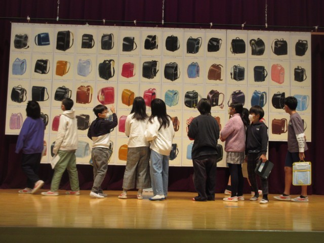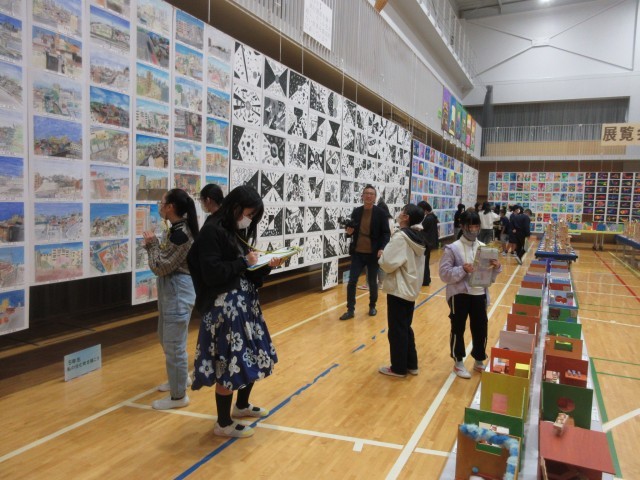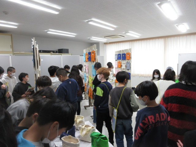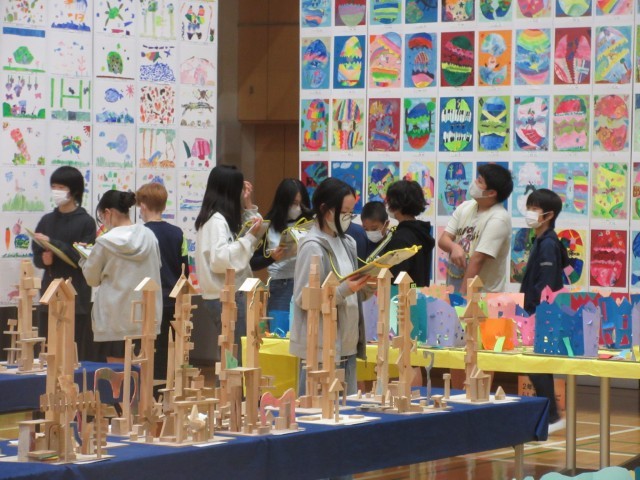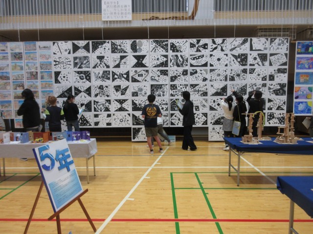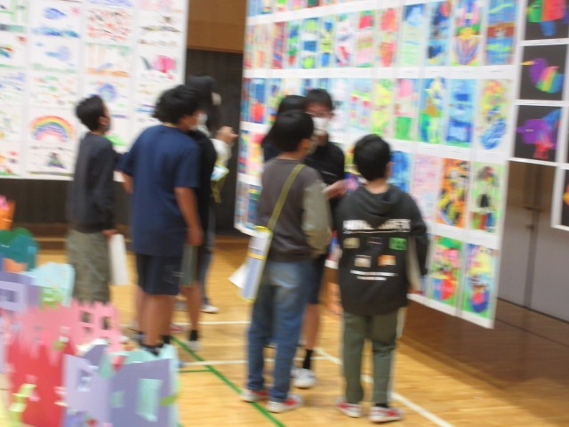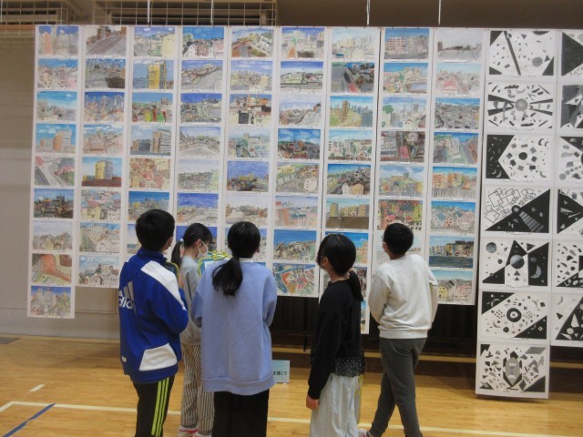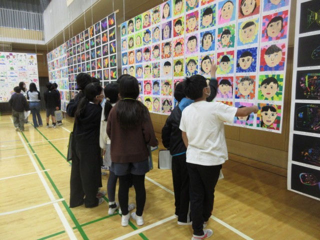 11月13日、展覧会1日目の児童鑑賞日、6年生が小学校生活最後の展覧会で作品を鑑賞しました。自分たちや他学年の作品を熱心に見ながら懐かしがったり自分たちが取り組んだ作品の感想を伝え合っていました。6年間の歩みを振り返りながら作品を見て充実した鑑賞時間を過ごしていました。また、会場中央からステージを見ると共同製作「未来への翼」が飛び立ち、後方に見える「思い出のランドセル」が6年間の小学校生活を表しているようで偶然にもベストスポットになっています。保護者の皆様、お子さんと記念写真を撮影したらいかがでしょう。(写真屋さんが集合写真を撮影していました)