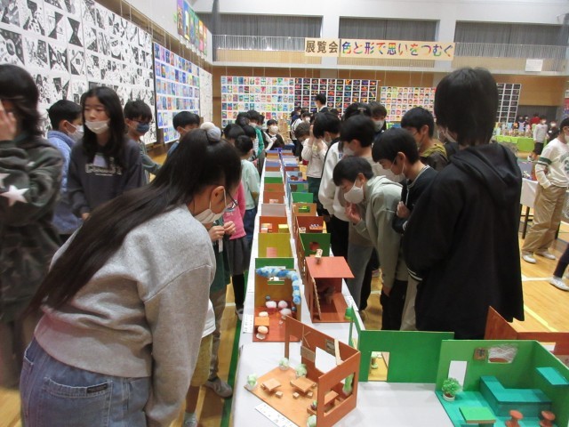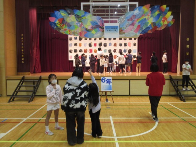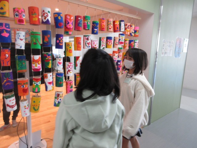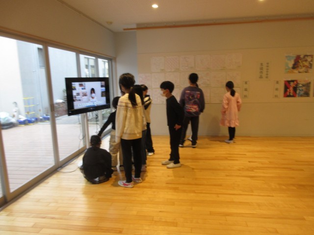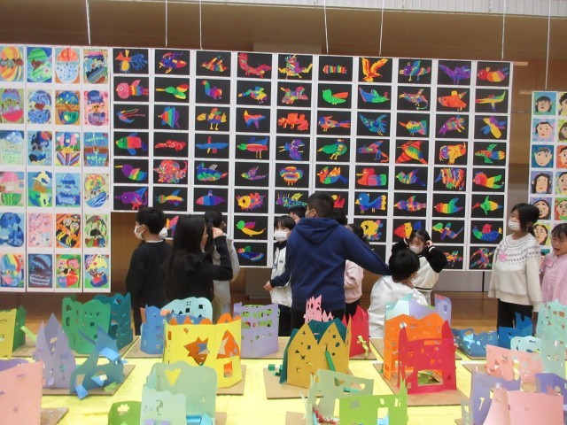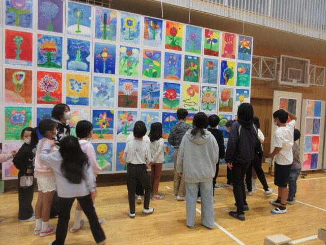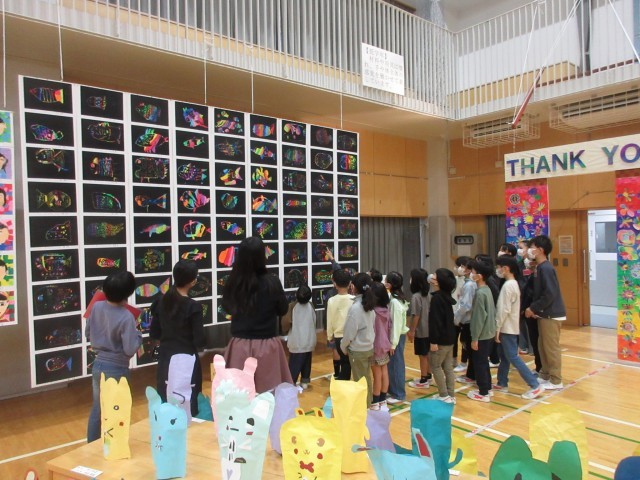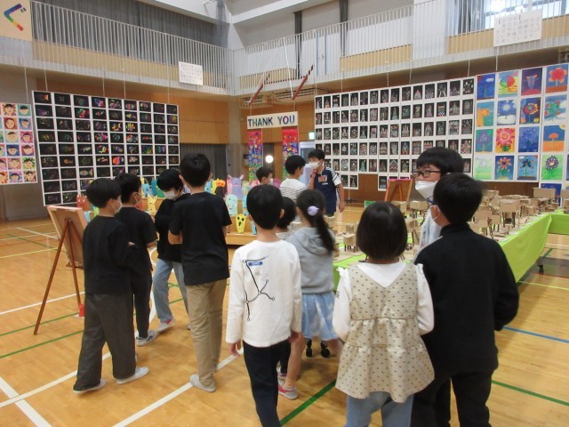 11月14日、1~6年生の異学年交流として活動している縦割り班で展覧会の鑑賞活動を行いました。会議室、1階ギャラリー、体育館を鑑賞するグループと教室で待機してタブレットで作品紹介や紙工作を作るグループに分かれ時間差をつけて活動しました。6年生がリーダーになり下学年に優しく接し、昨日に引き続き子どもたちは作品をしっかり鑑賞していました。